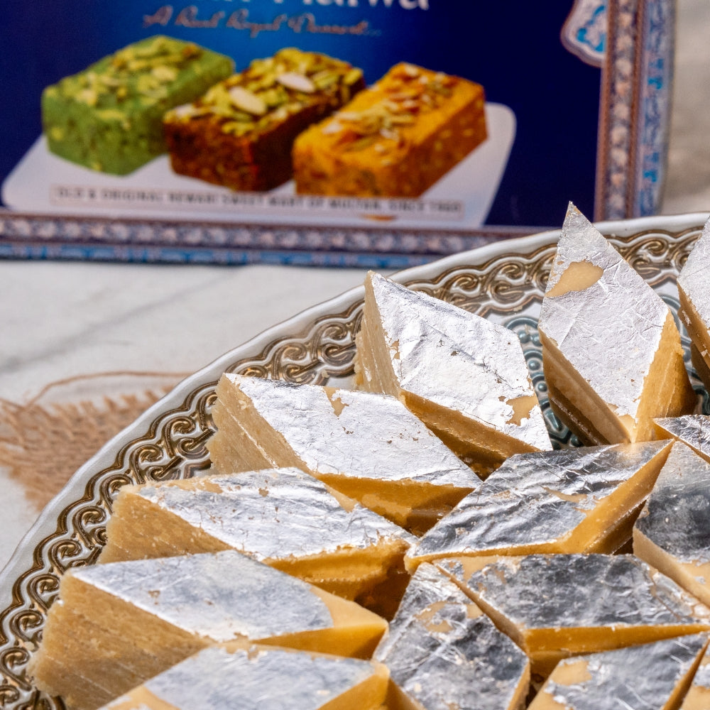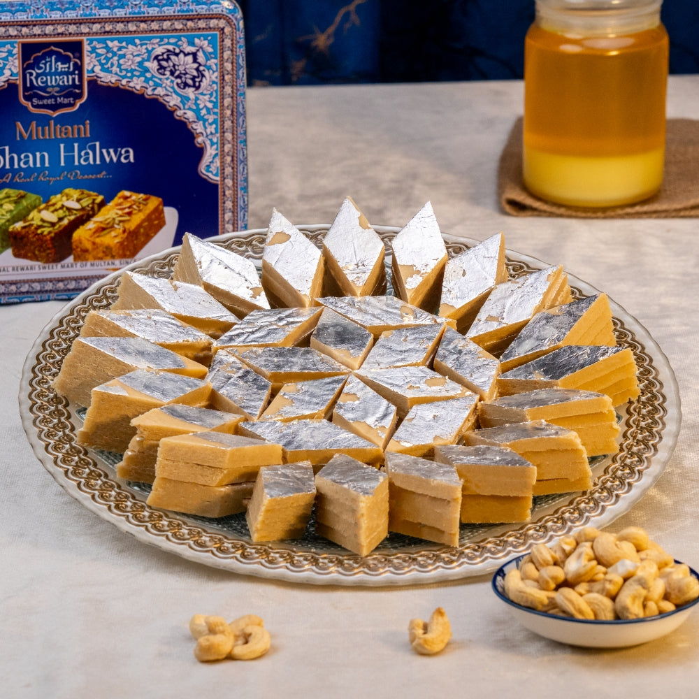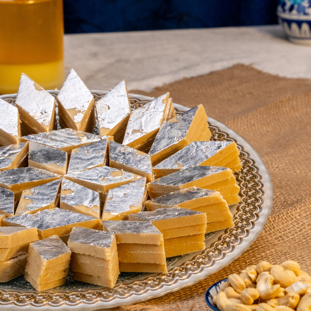 The rich taste of tradition with Rewari Sweet Mart's Kaju Katli, crafted with the finest ingredients and pure desi ghee. Each bite is a symphony of textures - a delicate melt-in-your-mouth experience followed by a satisfying crunch of real cashews.